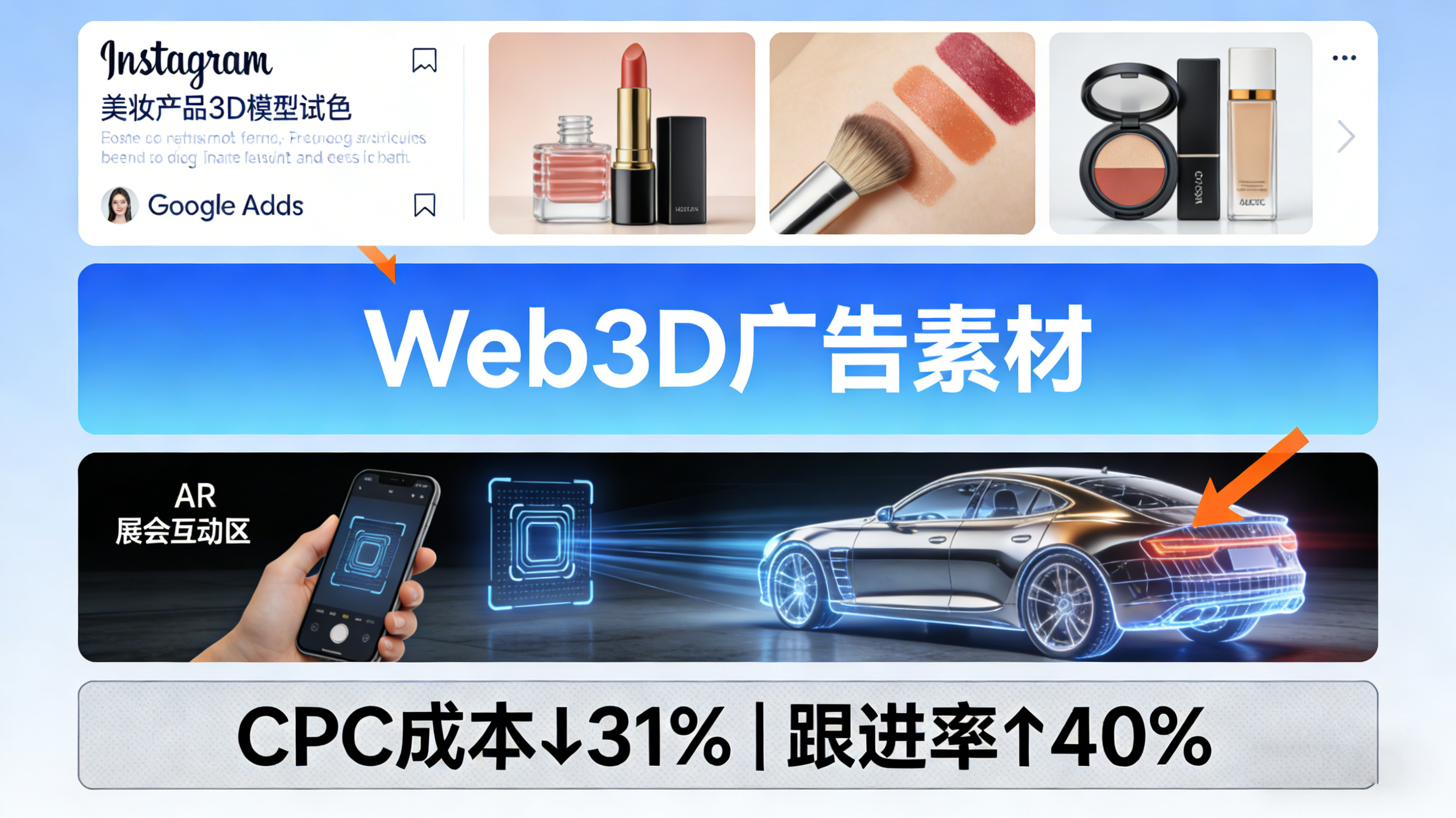 精准广告投放:Google Ads支持Web3D广告素材,用户点击后直接进入3D体验页。B2B软件公司Salesforce测试显示,Web3D广告点击率比传统视频高58%,转化率提升24%。