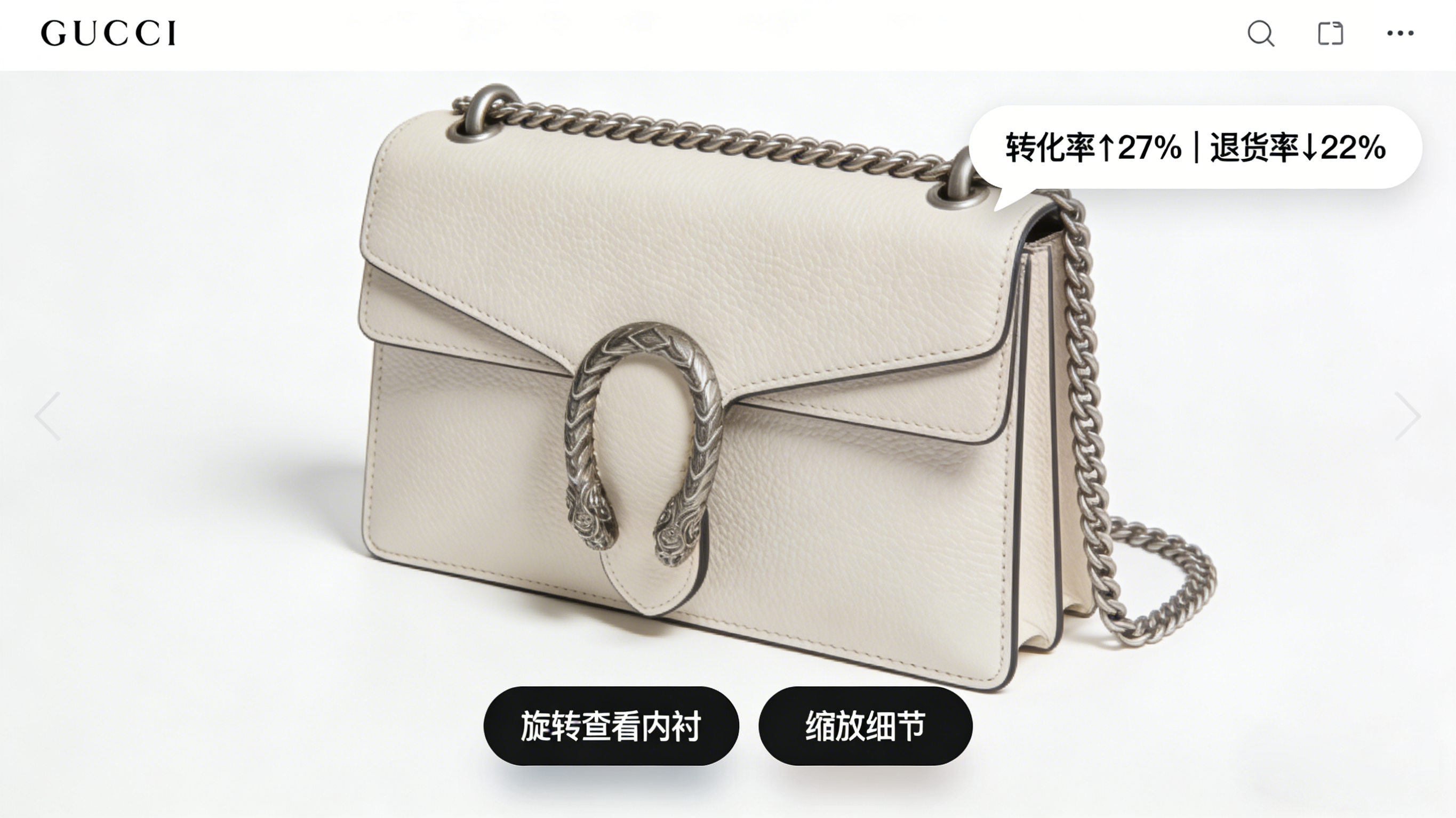 这种深度参与直接提升转化率。亚马逊研究显示:嵌入Web3D的3D产品展示页面,购买决策速度提升35%,退货率下降22%。例如,奢侈品牌Gucci在官网采用Web3D展示高定手袋,用户通过3D可视化探索内衬工艺,转化率提升27%。3D产品展示的核心价值,是将“信息传递”升级为“体验共创”——用户不再是被动接收者,而是产品价值的共同定义者。